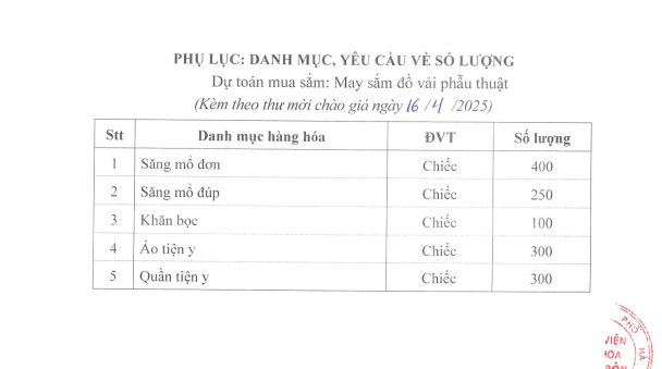 Chào giá may sắm đồ vải phẫu thuật 16-4-2025