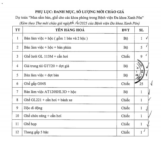 Chào giá mua sắm bàn ghế cho khoa phòng 6-6-2025