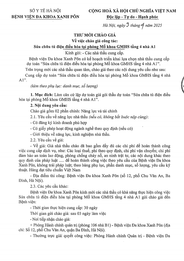 Chào giá sửa chữa tủ điện điều hòa khoa GMHS 9-4-2025