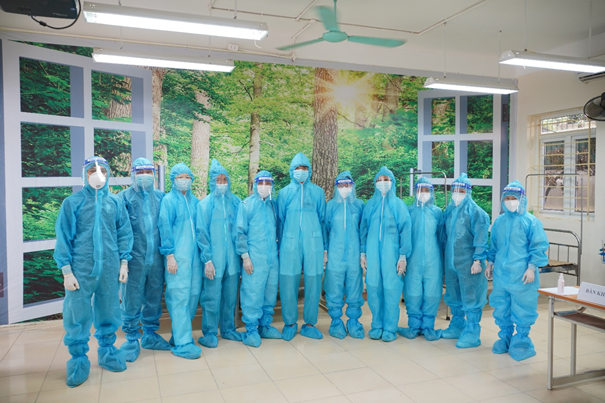 Ảnh: Các cán bộ y tế của BVĐK Xanh Pôn cùng các NVYT của TTYT quận Đống Đa và các tình nguyện viên