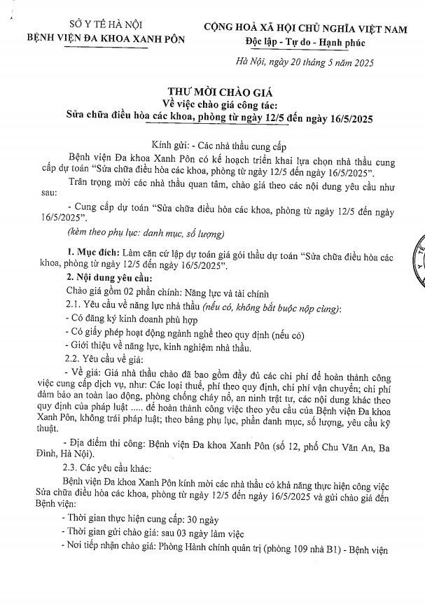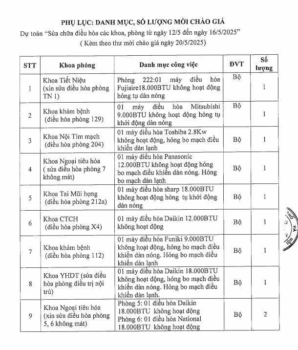 Mời báo giá công tác sửa chữa điều hòa các khoa phòng 20-5-2025