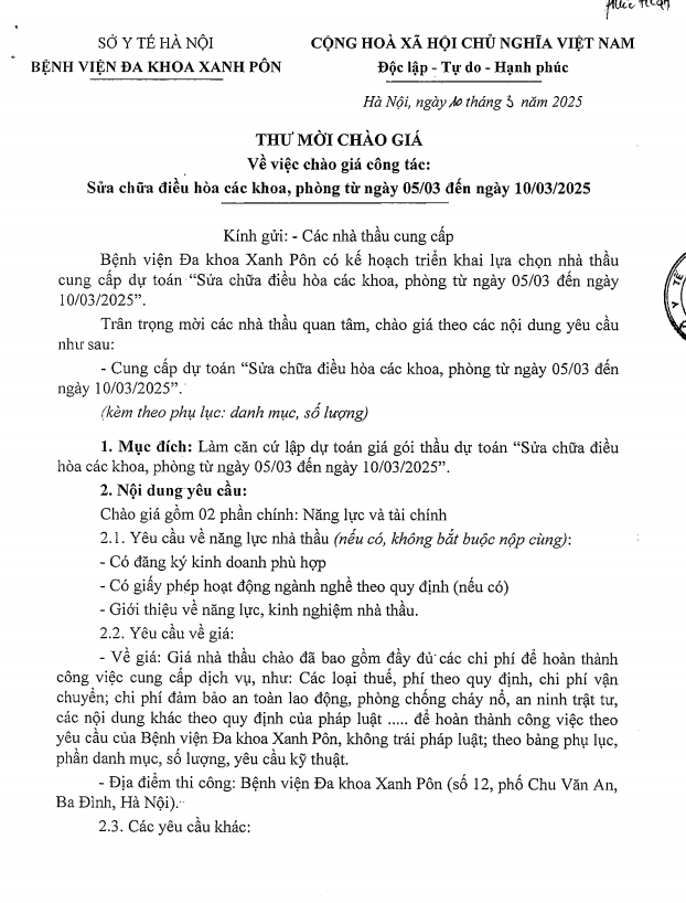 Mời chào giá công tác sửa chữa điều hòa các khoa từ ngày 5-3 đến 10-3-2025