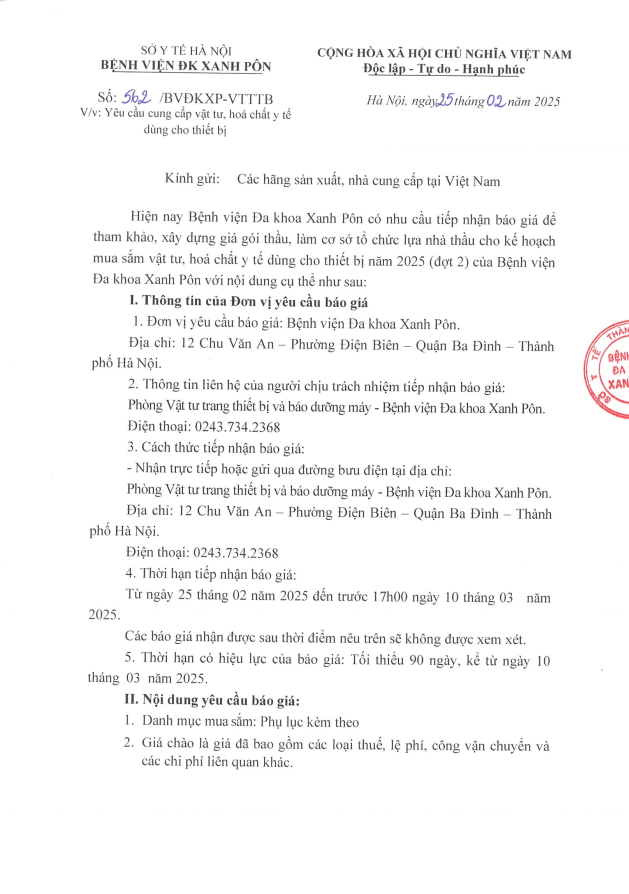 Mời chào giá cung cấp vật tư, hóa chất y tế dùng cho thiết bị 562-2025