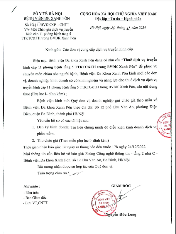 Mời chào giá: dịch vụ truyền hình cáp 11 phòng bệnh tầng 5 TTKTC vầ TH - CV4445 - 2024