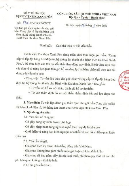 Mời chào giá - DV tư vấn cho gói thầu: Cung cấp và lắp đặt bảng Led điện tử, hệ thống âm thanh - CV846 - 2025
