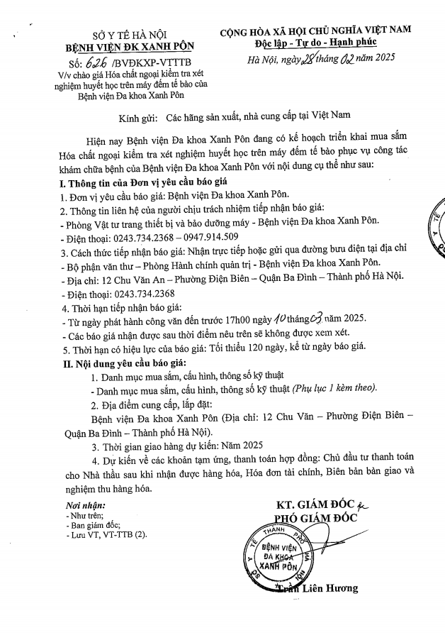 Mời chào giá hóa chất ngoại kiểm xét nghiệm huyết học 626-2025