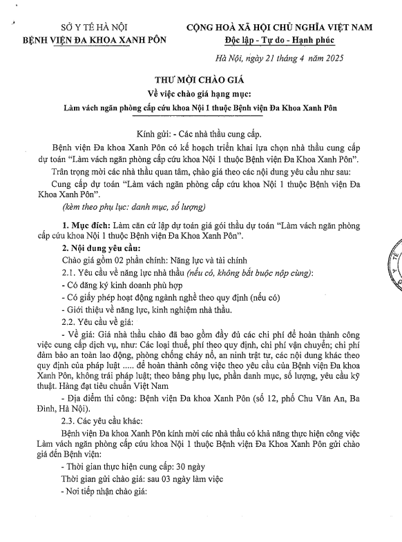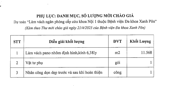 Mời chào giá làm vách phòng cấp cứu khoa nội 1 21-4-2025