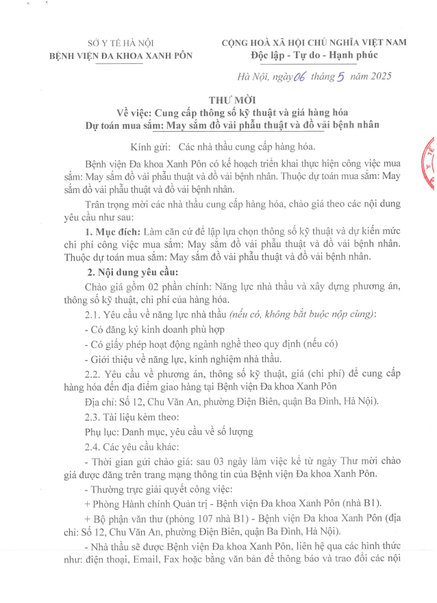 Mời chào giá may sắm đồ vải phẫu thuật và đồ vải bệnh nhân 6-5-2025