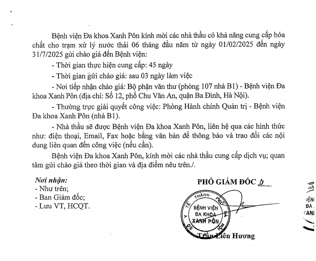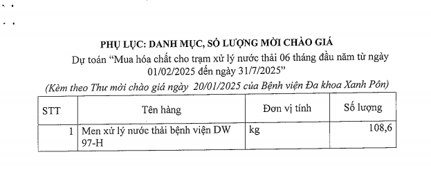 Mời chào giá mua hóa chất cho trạm xử lý nước thải 6 tháng đầu năm 2025