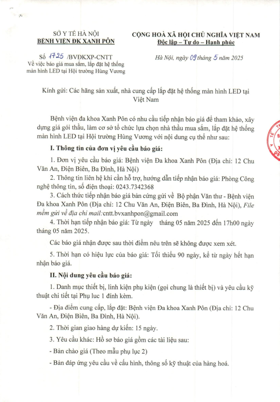Mời chào giá - Mua sắm, lắp đặt màn hình LED hội trường Hùng Vương - CV1725 - 2025