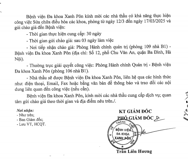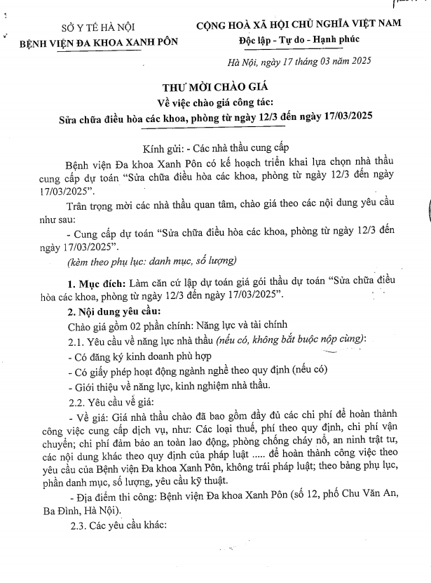 Mời chào giá sửa chưa điều hòa các khoa phòng từ 12-3 đến 17-3-2025