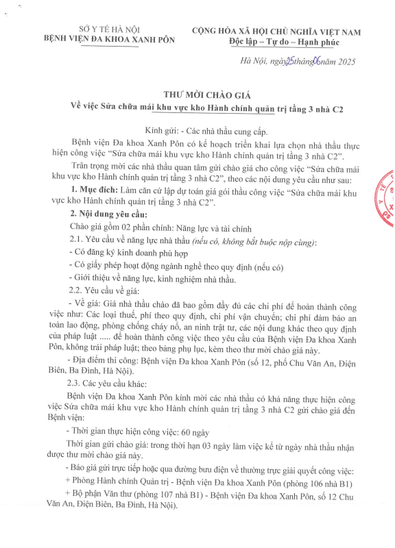 Mời chào giá sửa chữa mái khu vực kho Hành chính tầng 3 nhà C2 25-06-2025
